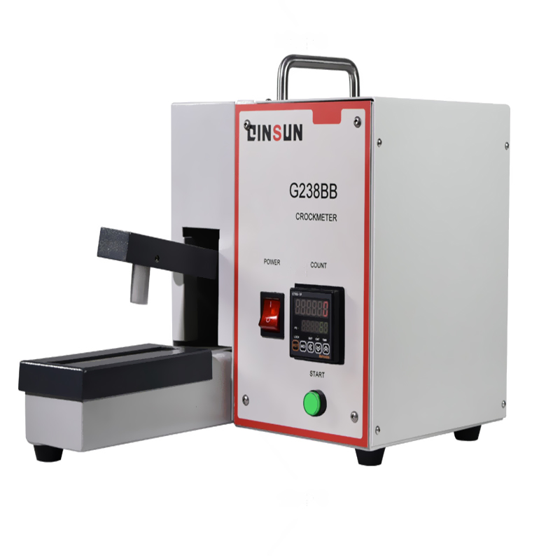 Electronic Crockmeter/Rubbing Fastness Tester is designed with a base, rubbing rotation mechanism and a counter. Fix the specimen and sand paper with the specimen clamp on one side of the base. Rotate the knob to rub the friction head with the white cotton cloth against the specimen in reciprocation motion with specified strokes. After ten times of friction between the white cloth and the specimen, assess the color transfer to the white cloth with a gray scale and the stability of dyed fabric specimen or surface coating so as to provide reference data for material assessing and selection.