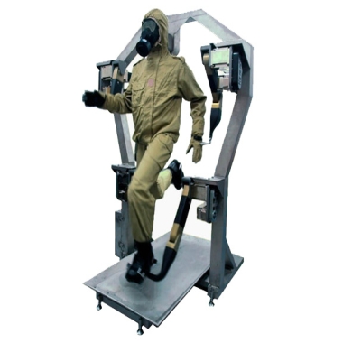 The mannequin is constructed from carbon composite materials and features a heated, sweating surface that accurately simulates human thermoregulation and perspiration. When mounted on its motorized drive frame, it can perform a wide range of human motions to reproduce realistic operational conditions for protective gear testing in controlled laboratory environments.