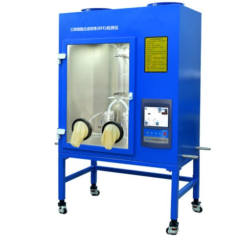 -is to determine the bacterial filtration efficiency (BFE) of medical face mask materials by employing a ratio of the upstream bacterial challenge to downstream residual concentration of the tested medical face mask materials. The tester provides certain flow rate of bacterial aerosol. The operator can measure the number of colony forming units passing through the medical face mask material, which is clamped between a six-stage Anderson cascade impactor and an aerosol chamber, expressed as a percentage of the number of colony forming units present in the challenge aerosol.