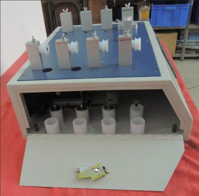 This machine is designed for the resistance of all shoelaces to abrasion. Two shoelaces are horizontally crossed in a moveable clamp, rubbing against each other, so as to determine their abrasive resistance.4 sets of specimens can be tested once.