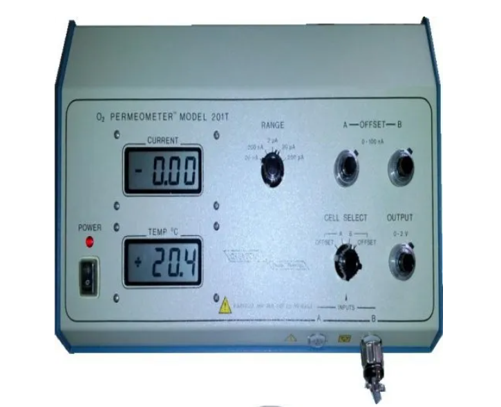 Measures contact lens oxygen permeability (Dk) and transmissibility (Dk/t) per ISO standards.
