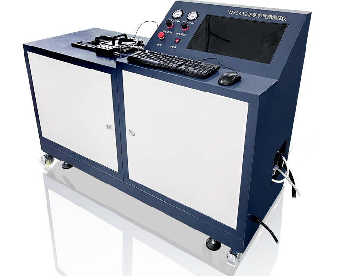 Thermal protection tester evaluates clothing materials' heat resistance per TPP standards.