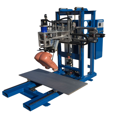 Generally, this machine has 4 servo-electric motor-driven axis and 3 pneumatic functions. These motions of the test dummy, relative to the test sample, include; in & out, right & left, up & down, rotation, free weight drop & recapture, and independent activation of the legs. Any or all of these motions can be performed concurrently and in any order.